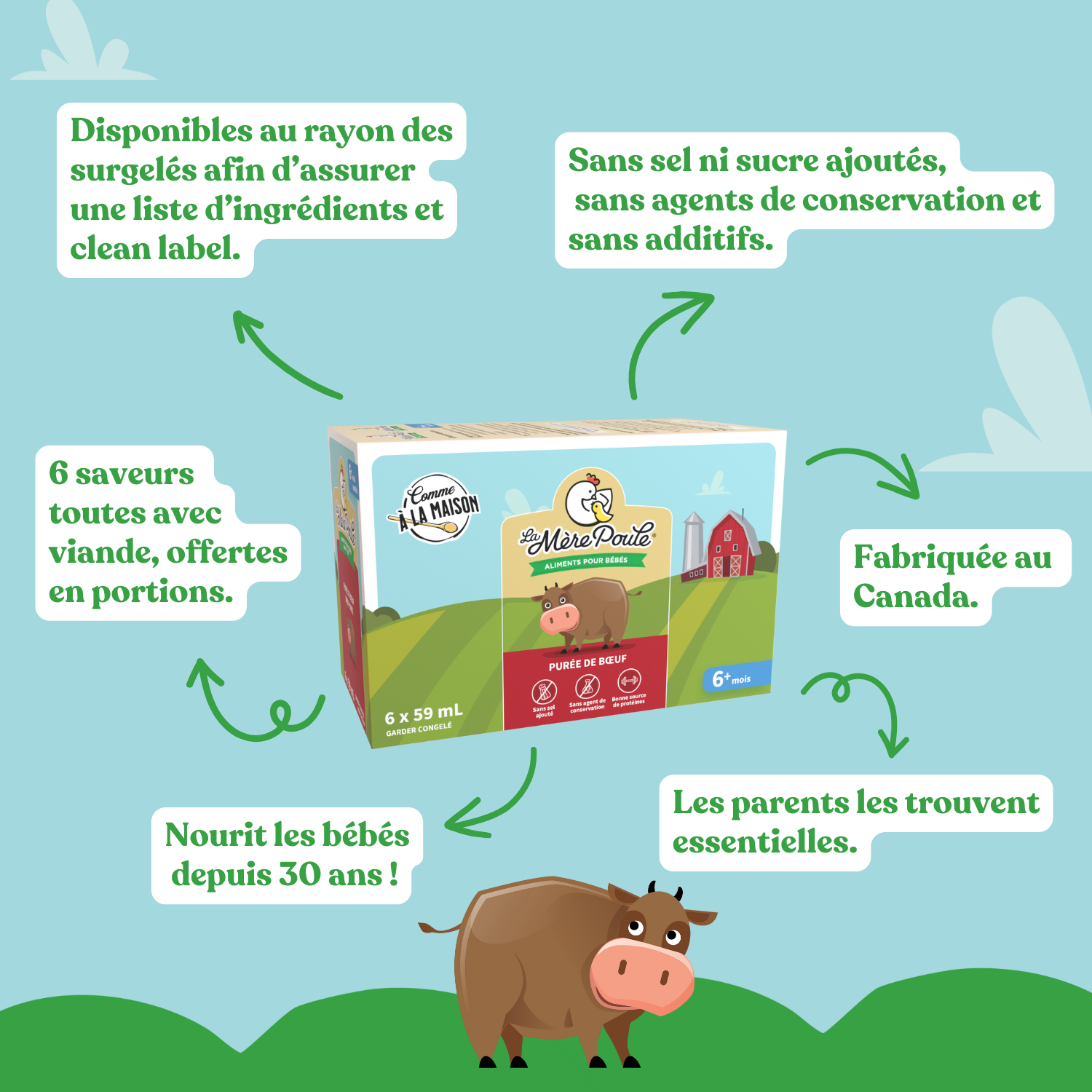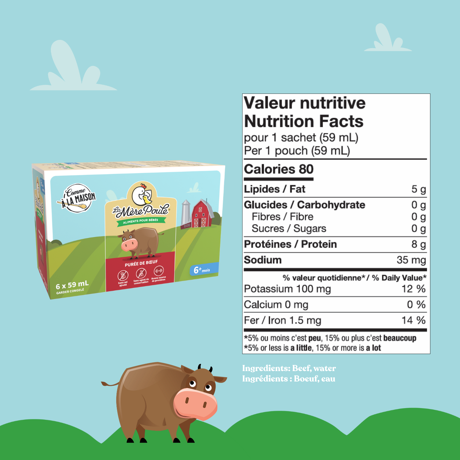 Notre purée de bœuf est une alliée exceptionnelle pour lutter contre la carence en fer chez bébé. Ce minéral aide à fixer l’oxygène du sang pour le mettre en réserve dans les muscles et est essentiel au bon développement de votre enfant dès 6 mois. C’est pourquoi notre purée de bœuf est un outil de choix dans le garde-manger du parent Poule!